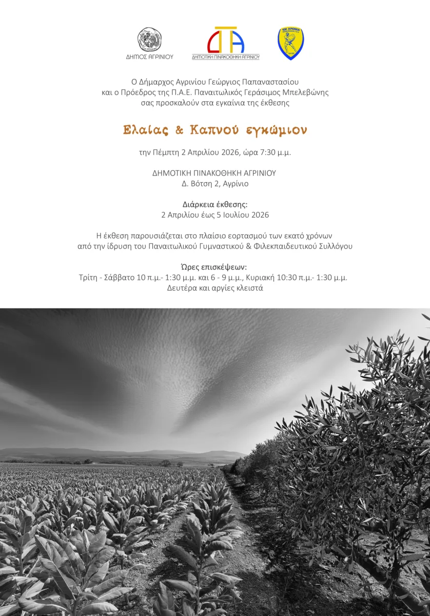 Τα εγκαίνια της έκθεσης θα πραγματοποιηθούν την Πέμπτη 2 Απριλίου 2026, ώρα 7.30 μ.μ. στη Δημοτική Πινακοθήκη Αγρινίου (Δ. Βότση 2, δίπλα από το Δημαρχείο) και θα διαρκέσει έως 5 Ιουλίου 2026.